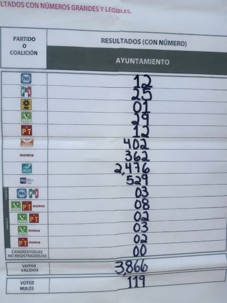 El consejo electoral municipal informó que se emitieron 3,859 votos válidos y 127 nulos. Alexis Verduzco obtuvo 2,476 votos, seguido por la candidata del PES con 529 votos. La coalición Morena-PT-PVEM recibió 418 votos, MC obtuvo 402 votos, la alianza PRI-PAN consiguió 40 votos y el PRD solo un voto.