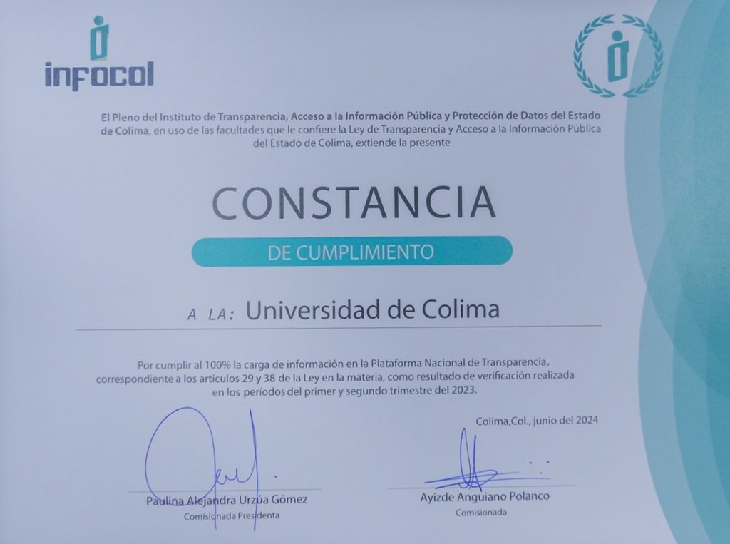 En un acto celebrado en el Salón de Protocolo de la Rectoría, la Universidad de Colima (UdeC) recibió del Infocol la Constancia de Cumplimiento, “por cumplir al 100% la carga de información en la Plataforma Nacional de Transparencia, correspondiente a los artículos 29 y 38 de la Ley en la materia, como resultado de la verificación realizada en los períodos del primero y segundo trimestre del 2023”.