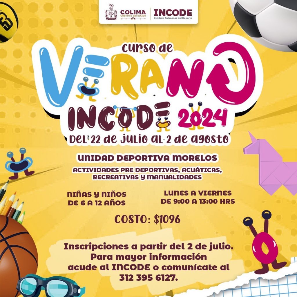 El Instituto Colimense del Deporte (Incode) alista el programa general del Curso de Verano 2024 que se realizará del 22 de julio al 2 de agosto en la Unidad Deportiva “José María Morelos y Pavón” de Colima, de lunes a viernes de 9 de la mañana a una de la tarde, para niñas y niños de 6 a 12 años de edad, informó el director general de la dependencia, Alejandro Rodríguez Alvarado.