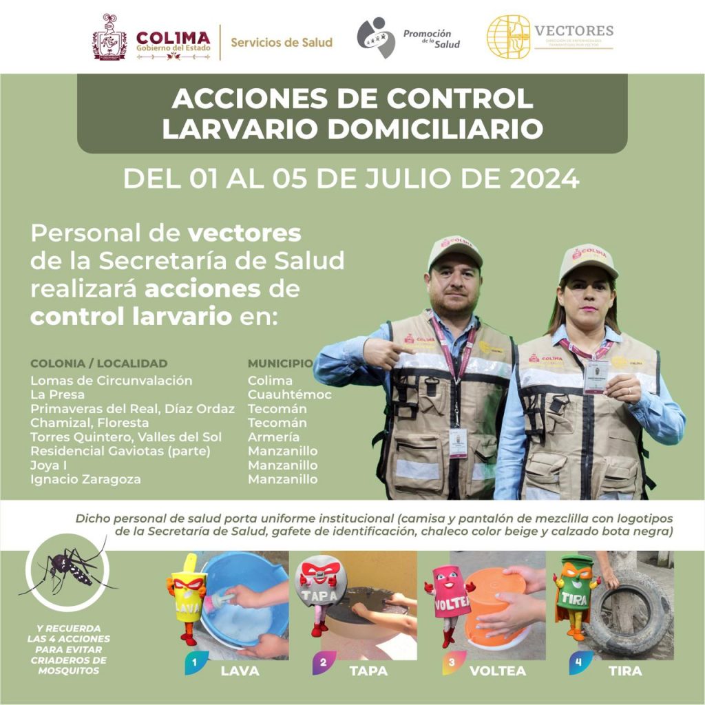 Como parte del reforzamiento a las acciones de combate al dengue, zika y chikungunya para proteger la salud de la población en el estado de Colima, personal de Vectores de la Secretaría de Salud delGobierno del estado continuará realizando del lunes 1 al viernes 5 de julio, acciones de control larvario en viviendas con casos probables de dengue de 8 colonias de los municipios de Armería, Colima, Cuauhtémoc, Manzanillo y Tecomán.