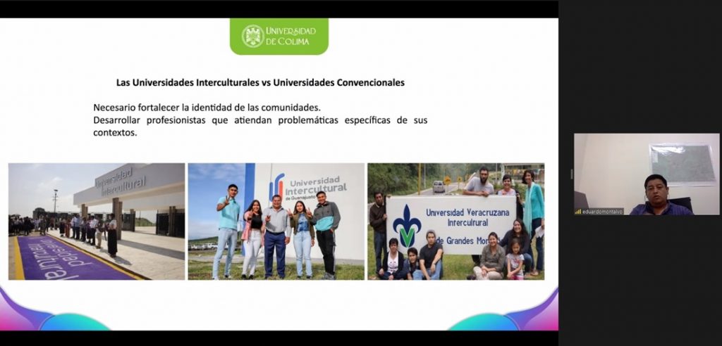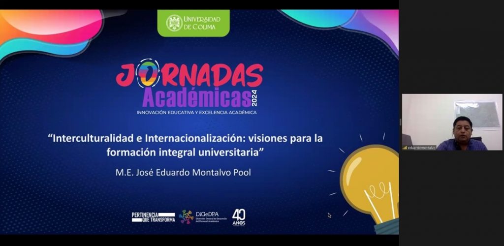Como parte de las actividades de las Jornadas Académicas 2024 de la Universidad de Colima (UdeC), se impartió en modalidad virtual la conferencia “Interculturalidad e internacionalización: visiones para la formación integral universitaria”, a cargo de José Eduardo Montalvo Pool, coordinador de Movilidad e Intercambio Académico de la Universidad Intercultural Maya, Quintana Roo.