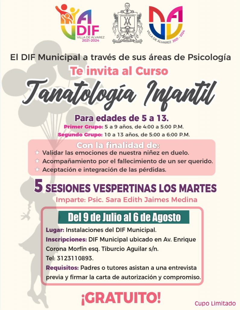 El Ayuntamiento de Villa de Álvarez, a través del área de psicología del DIF Municipal, invita al curso gratuito “Tanatología Infantil” para niños y niñas de 5 a 13 años, con el objetivo de fortalecer la salud mental de las infancias.