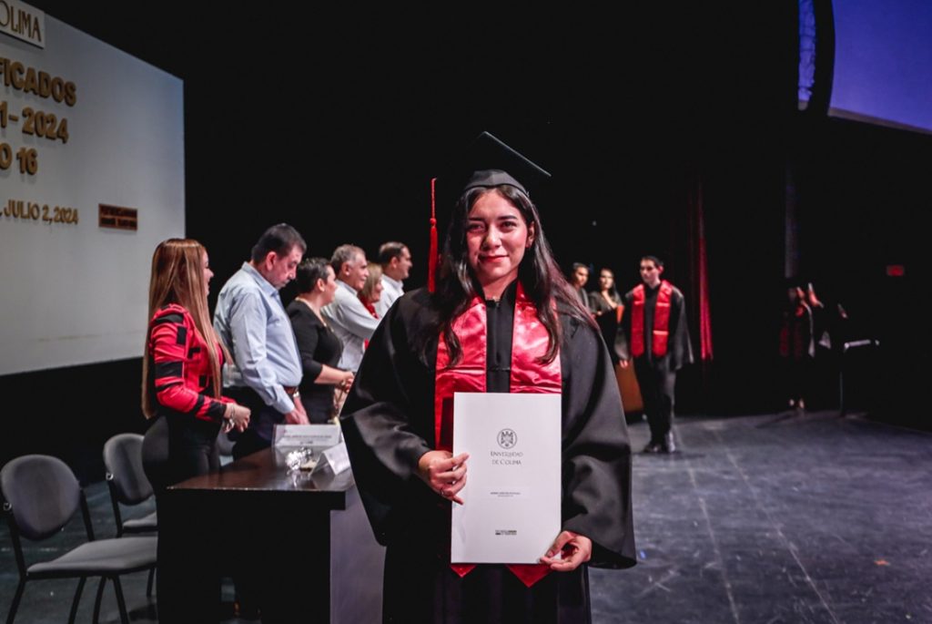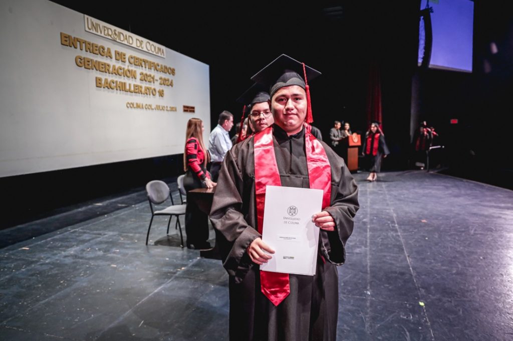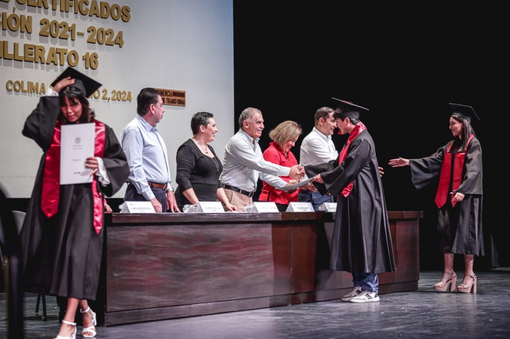 La Universidad de Colima (UdeC) entregó 260 certificados a igual número de egresados y egresadas del Bachillerato 16, generación 2021-2024, de las áreas Bachillerato General, Técnico Analista Químico y Técnico Analista Programador, en una ceremonia realizada en el Teatro Universitario.