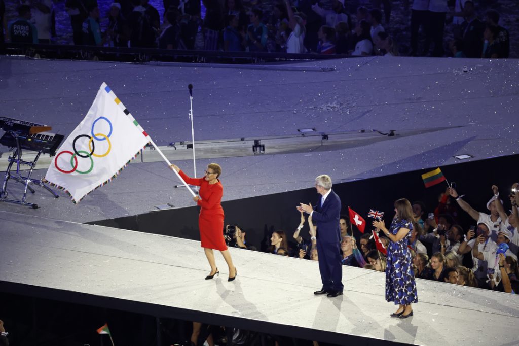 La alcaldesa de París, Anne Hidalgo, entregó la enseña olímpica a Thomas Bach y éste se la cedió a Karen Bass.