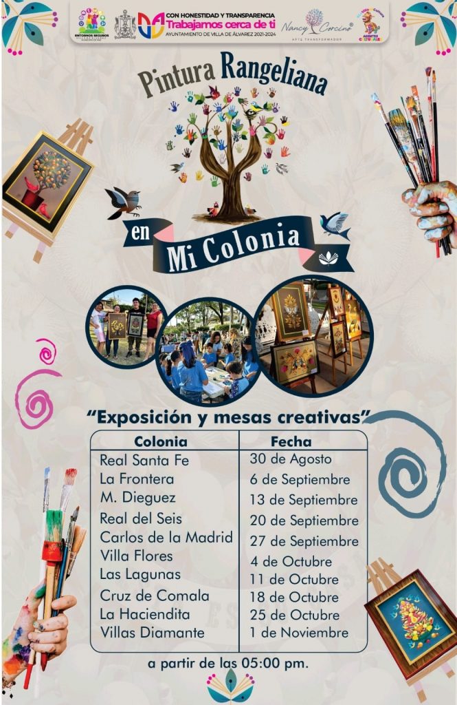 La exposición de pinturas rangelianas y las mesas creativas iniciarán en la colonia Real Santa Fe este 30 de agosto, continuarán en La Frontera el 6 de septiembre, en la M. Diéguez el 13 de septiembre, Real del Seis 20 de septiembre, Carlos de la Madrid 27 de septiembre, Villa Flores 4 de octubre, Las Lagunas 11 de octubre, Cruz de Comala 18 de octubre, La Haciendita 25 de octubre y Villas Diamante 1 de noviembre.