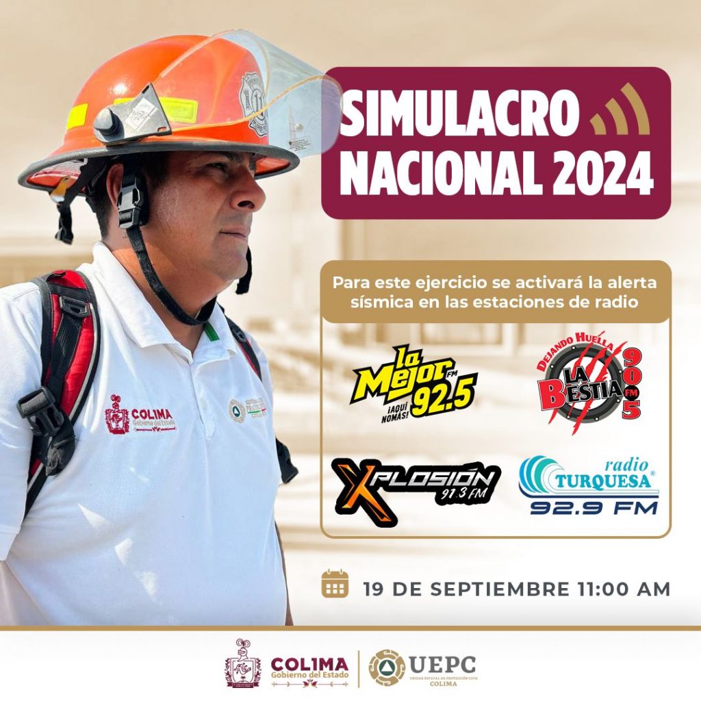 Para ese ejercicio preventivo, se activarán los receptores de alerta sísmica con los que cuenta el estado de Colima, instalados en 4 estaciones radiofónicas: La Mejor 92.5 FM, La Bestia 90.5 FM, Xplosión 91.3 FM y Radio Turquesa 92.9 FM, así como en las aplicaciones móviles de alertamiento sísmico.
