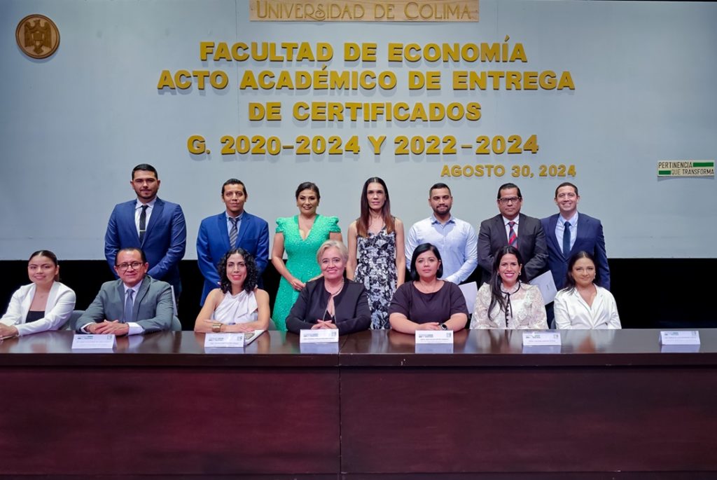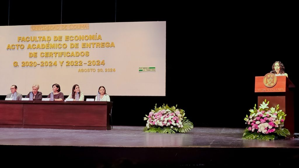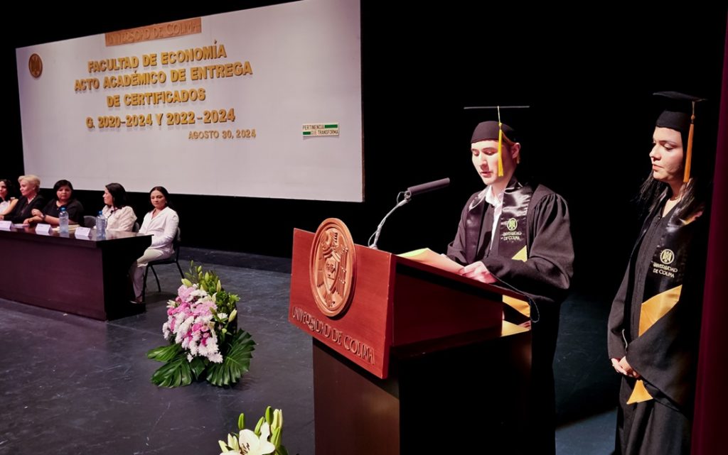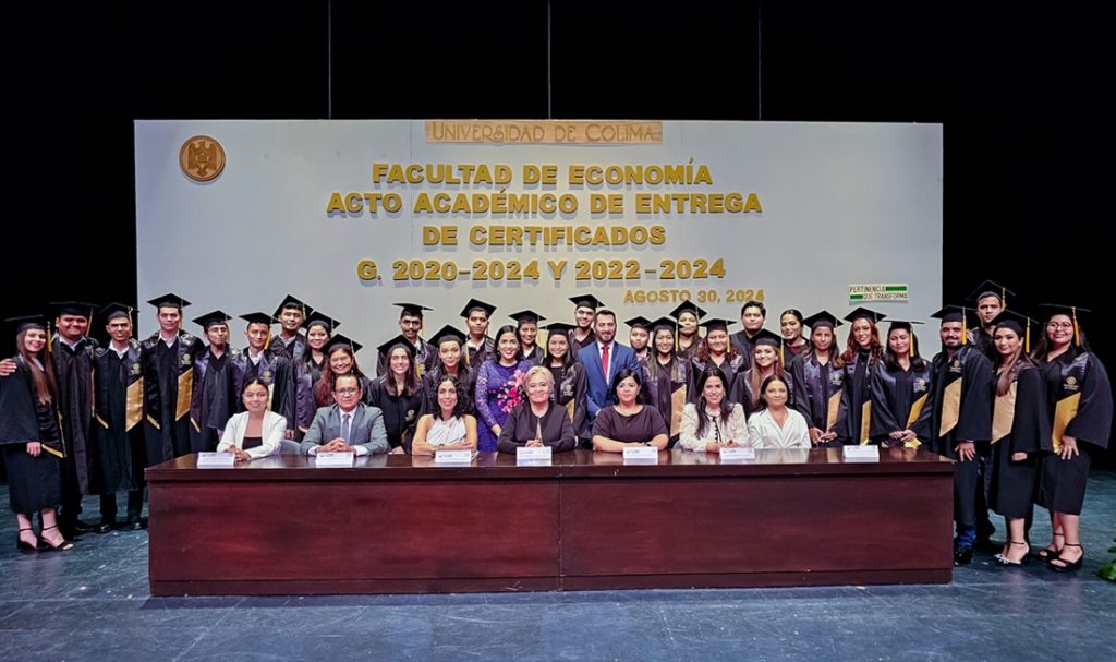 En un emotivo acto académico realizado en el Teatro Universitario “Coronel Pedro Torres Ortiz”, la Universidad de Colima (UdeC) celebró la graduación de 195 estudiantes de las licenciaturas en Economía, Finanzas y Negocios Internacionales, generaciones 2020-2024, así como de la Maestría en Gestión del Desarrollo, generación 2022-2024.