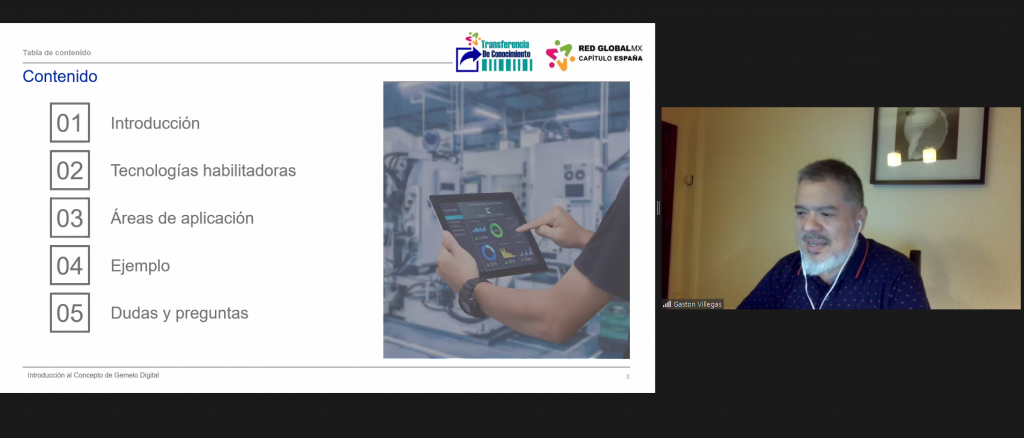 En el marco del Programa de Transferencia de Conocimiento “Red Global MX Capítulo España y la UdeC”, se impartió la conferencia “Introducción al concepto de gemelo digital”, a cargo del experto José Gastón Villegas Sifuentes. La clase virtual fue para estudiantes de las facultades de Ingeniería Electromecánica, de Telemática y de Ingeniería Mecánica y Eléctrica de la Universidad de Colima.