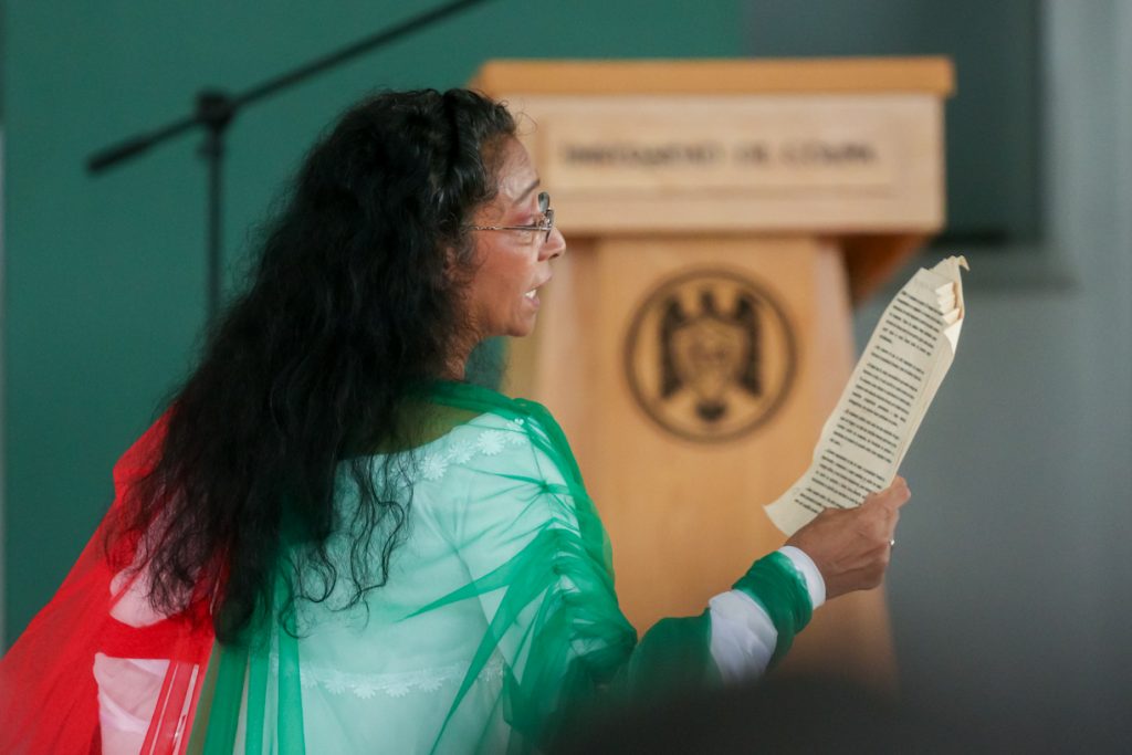 Para rendir los honores a la bandera, se contó con la escolta del Bachillerato 13 del municipio de Cuauhtémoc. Además, como parte del programa, la actriz y dramaturga Carmen Solorio hizo una lectura dramatizada que tituló “Amar la patria como Vicente Suárez la amó”, texto inspirado en la obra “Cartas y poemas de un guerrero”, de Antonio Velasco Piña y en el poema “Los niños mártires de Chapultepec”, de Amado Nervo.