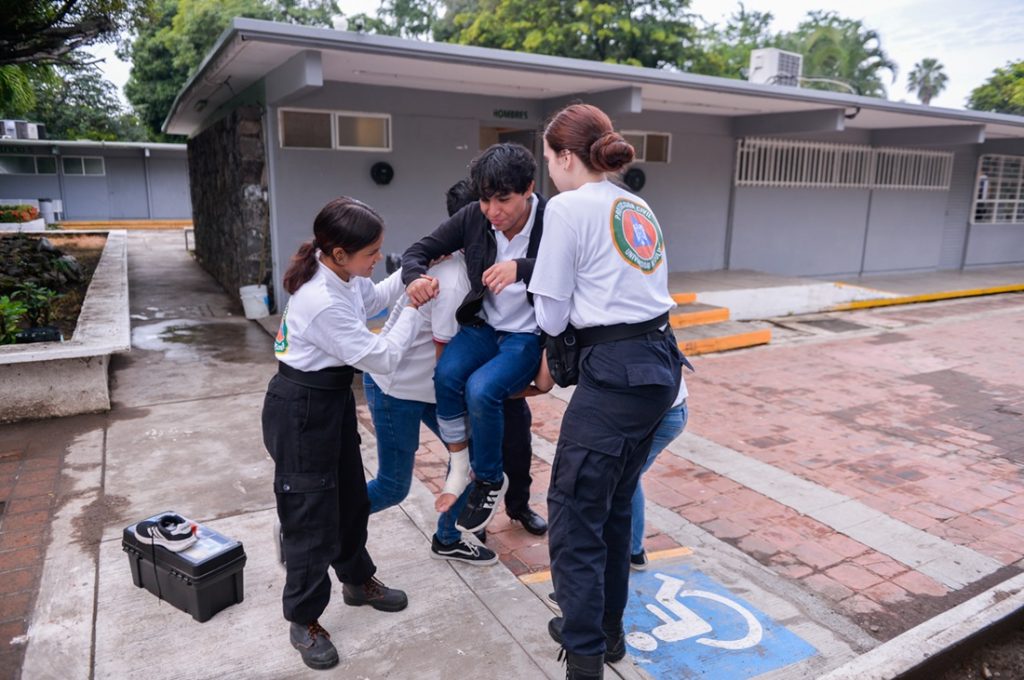En este primer simulacro, las y los alumnos que salieron más rápido de sus salones lo hicieron en 34 segundos y los que tardaron más en 54. Se ejecutó la hipótesis de 3 personas lastimadas, a las que primero atendió personal de la Brigada de Protección Civil de la UdeC, entablillándolas, y posteriormente se llamó a una ambulancia para completar el ejercicio.