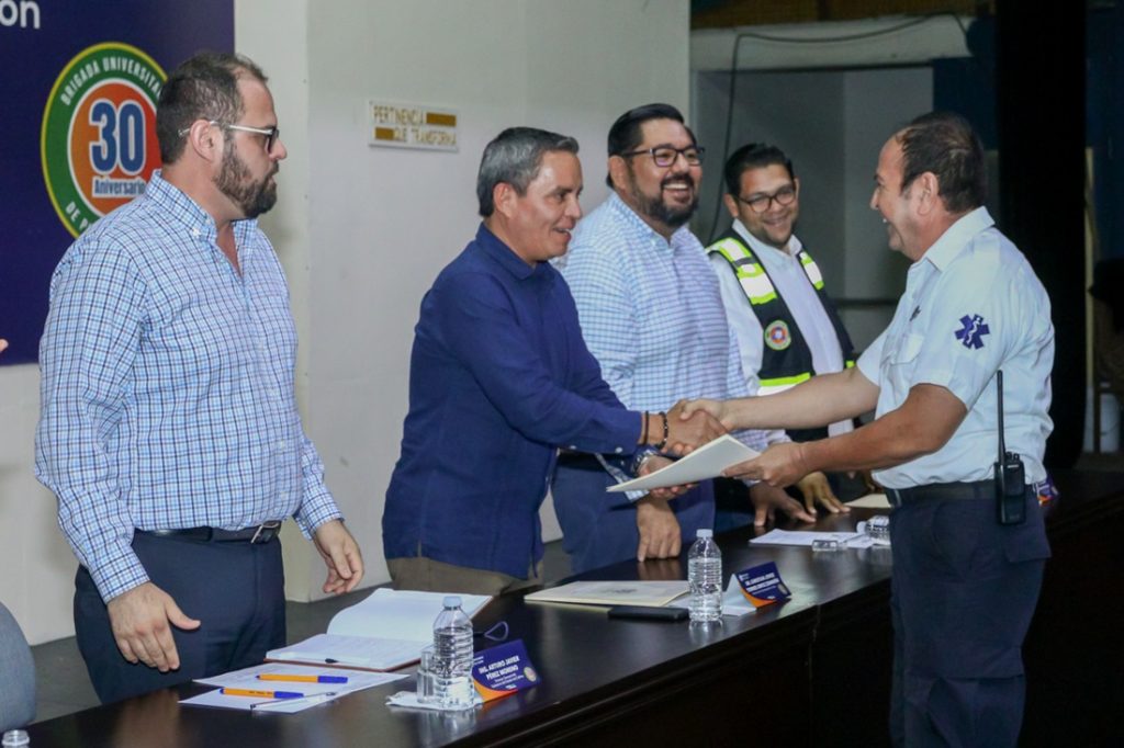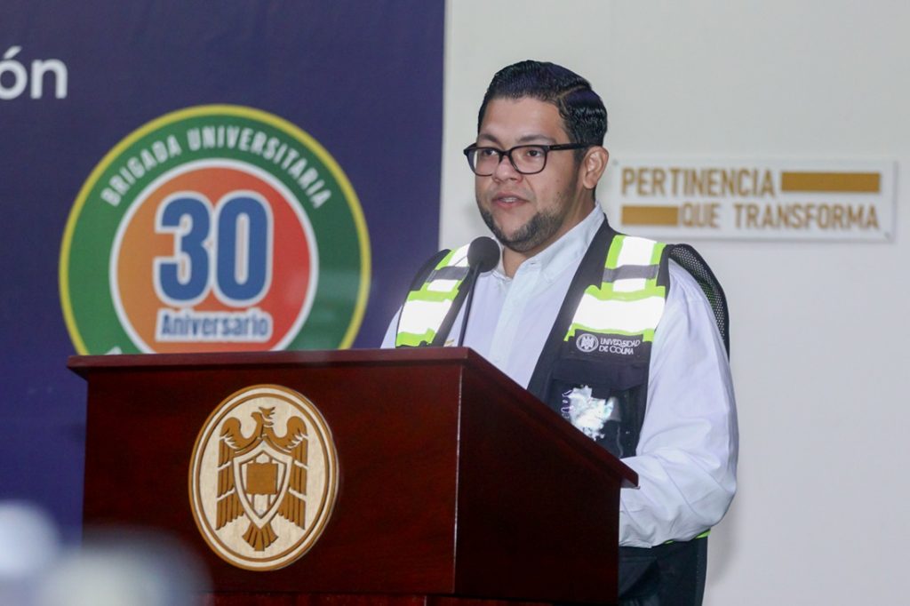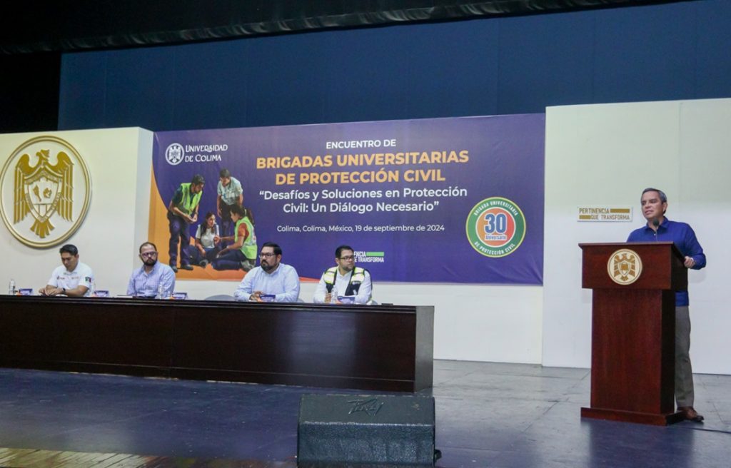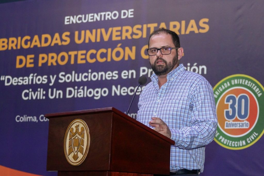 Destacó que, en la Universidad de Colima, las brigadas universitarias de protección civil “han sido una buena práctica en la construcción de una comunidad más segura y preparada para saber actuar de manera eficaz en momentos de crisis, y que en su labor van más allá de una respuesta inmediata ante la prevención de riesgos de desastres, participando en las etapas de gestión de riesgos desde su identificación y reducción hasta la recuperación”.