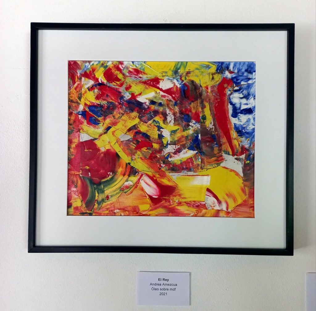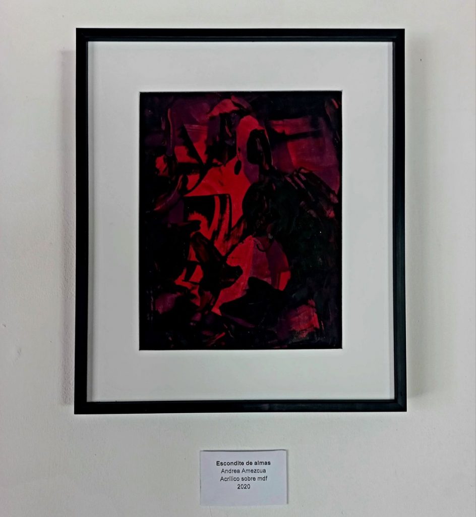 Andrea Salazar Amezcua, quien estudia la Licenciatura en Artes Visuales, presenta 3 obras trabajadas con las técnicas del acrílico y el óleo. Se interesó en el dibujo y las artes visuales desde secundaria, luego tomó clases con los pintores de andador Constitución y más tarde ingresó al taller de Dibujo Fotorrealista, impartido por el artista Antonio Carranza.