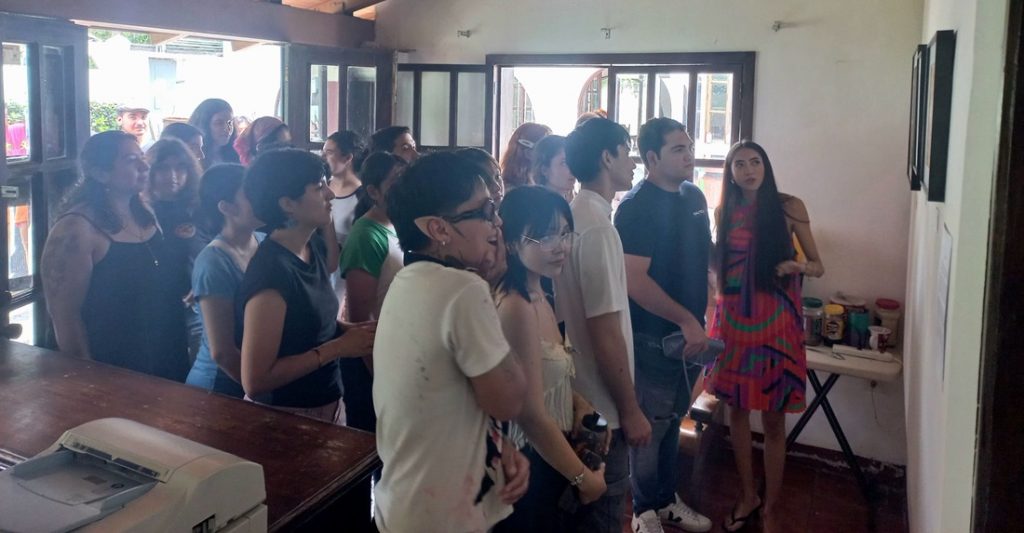 Acompañada por amigos, compañeros y docentes, Andy Amezcua inauguró la exposición “Viajando en los sueños”, en el Muro Km10 del Departamento de Artes Visuales del Instituto Universitario de Bellas Artes (IUBA) de la Universidad de Colima (UdeC), en la Exhacienda de El Cóbano.