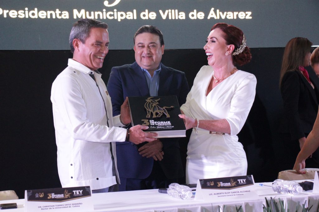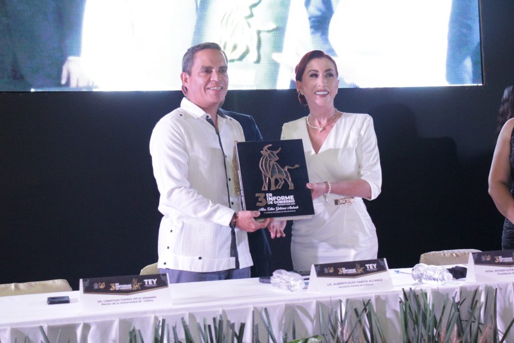 El rector de la Universidad de Colima, Christian Jorge Torres Ortiz Zermeño, fue uno de los invitados especiales al tercer informe de labores de la presidenta municipal de Villa de Álvarez, Esther (Tey) Gutiérrez Andrade, el último de su primera administración, rendido este viernes por la tarde en la explanada de Casa de la Cultura de ese municipio, ante el cabildo villalvarense y la sociedad en general.