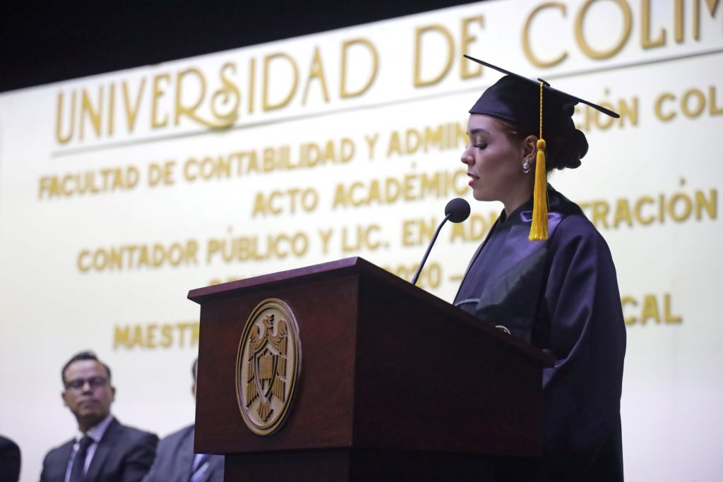 Ximena Valencia Ramírez, en nombre de las y los egresados en Contador Público, y Karla Urzúa Leyva, por las y los de Administración Pública, dijeron sentirse orgullosas y agradecidas con esta institución educativa que les brindó “valores fundamentales” para su formación académica y profesional, con profesores y compañeros que los acompañaron en su camino. Agradecieron a sus familias “por el apoyo y amor incondicional”.