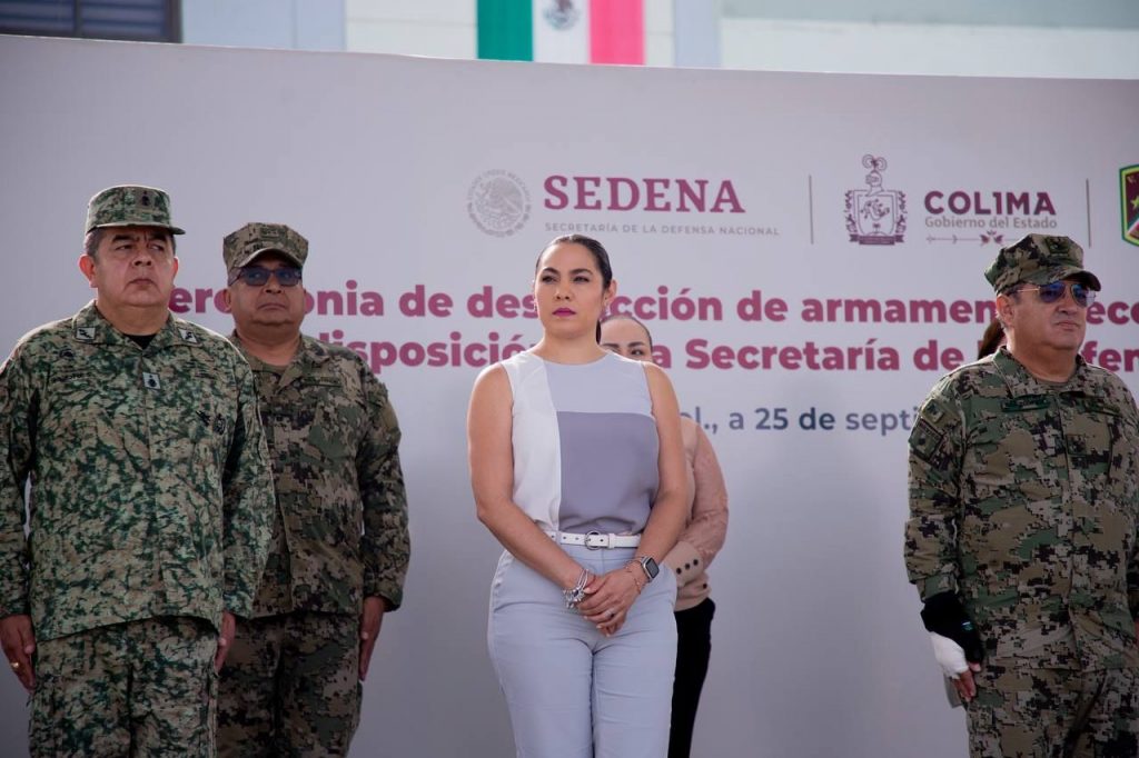 La mañana de este miércoles 25 de septiembre se llevó a cabo en las instalaciones de la Vigésima Zona Militar, en el municipio de Colima, la ceremonia de destrucción de armamento decomisado y puesto a disposición de la Secretaría de la Defensa Nacional (Sedena), a la cual asistió la gobernadora Indira Vizcaíno Silva y diversas autoridades.