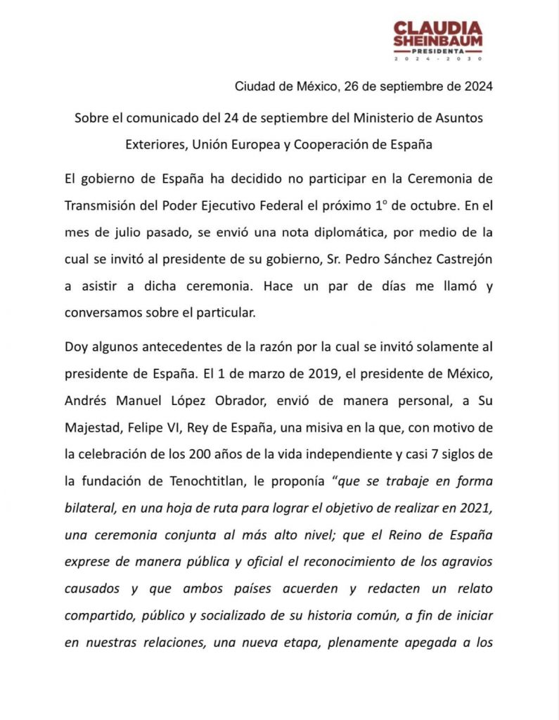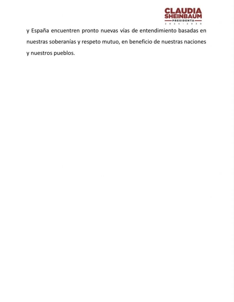 En la carta original, publicada la mañana del miércoles, Sheinbaum recordó que el presidente López Obrador envío al Rey una carta “con motivo de la celebración de los 200 años de la vida independiente y casi 2 siglos de la fundación de Tenochtitlán”.