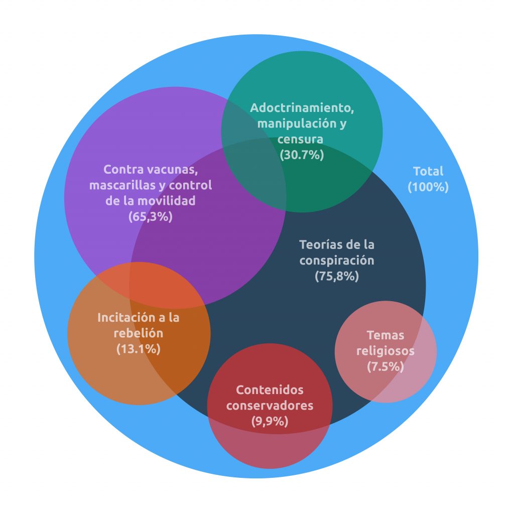 En un estudio recientemente publicado sobre la página en Facebook No al Nuevo Orden Mundial, se encontró un ecosistema de información cargado de ideas negacionista, antivacunas y conspiracionistas, aunado a ideas conservadoras (antifeministas, anti LGBT+, anticomunistas, pro-cristianas, entre otras) y a discursos de odio, como se puede ver en la Figura 1. El hecho de que estos contenidos circulen en Facebook pone en tela de juicio el supuesto sistema de censura de dicha red social para combatir la desinformación, ya que circulan contenidos descontextualizados o incluso completamente falsos.