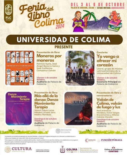 La Subsecretaría de Cultura del Gobierno del estado de Colima inaugurará este jueves (3) la “Feria del Libro Colima 2024” con actividades gratuitas para toda la familia que se desarrollarán del 3 al 6 de octubre en el Museo Palacio de Gobierno de Colima y el Teatro Hidalgo, donde el público colimense podrá disfrutar de conciertos, talleres y espectáculos literarios con artistas de distintos estados del país. Además, 25 autores presentarán sus más recientes libros.