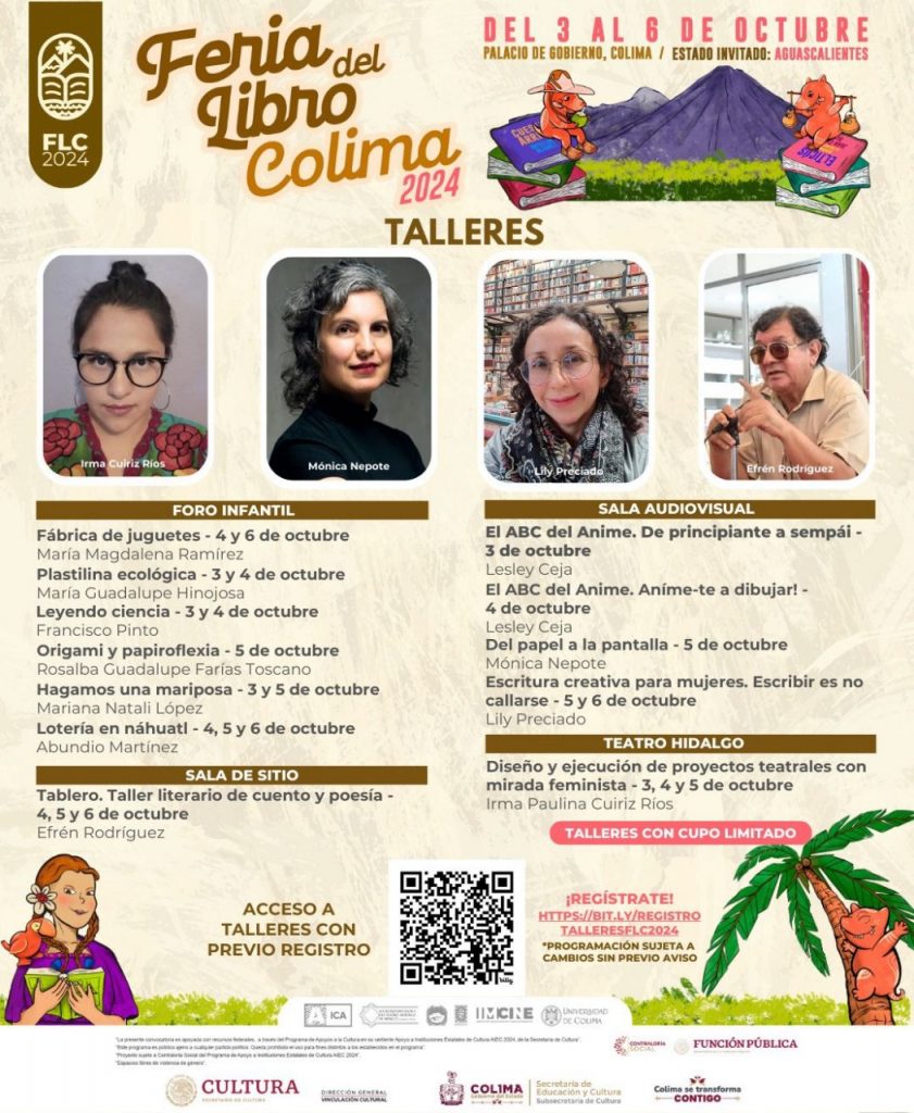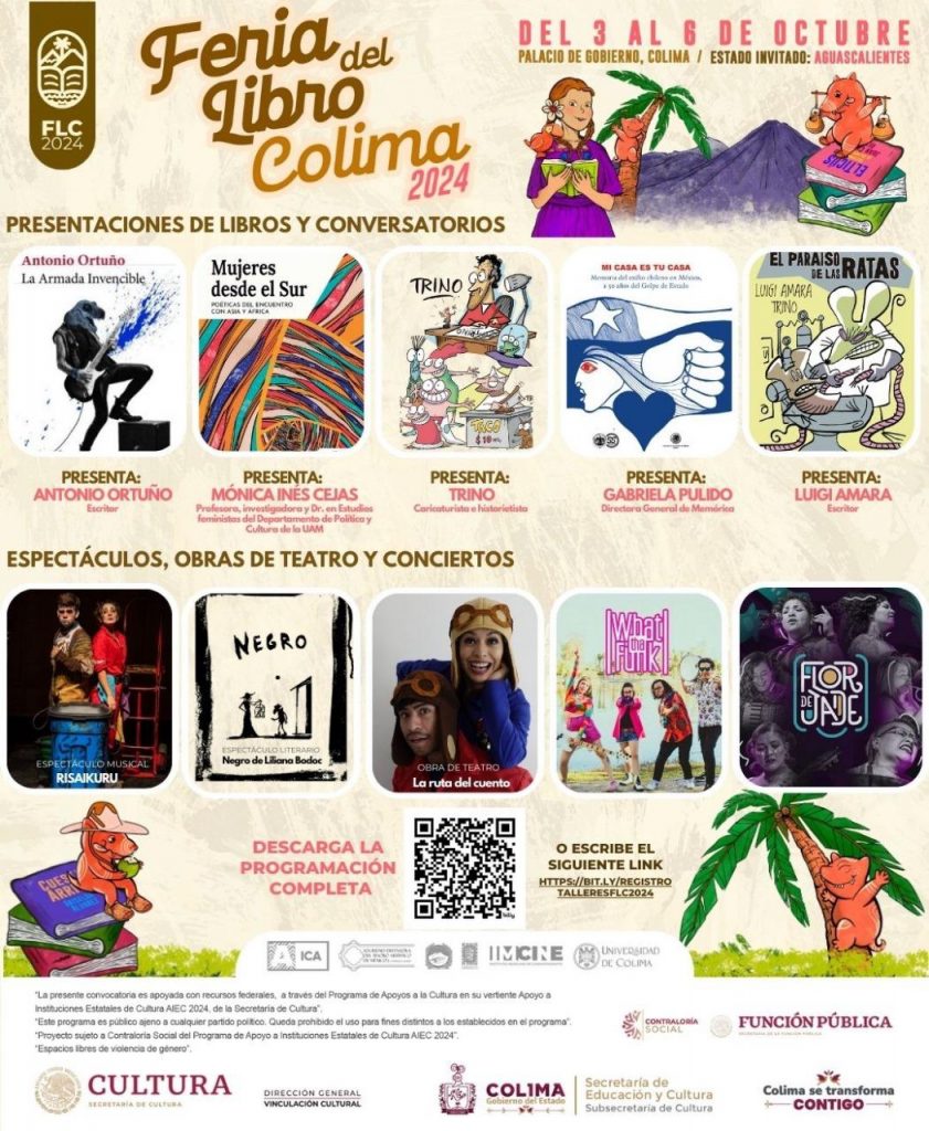 Según se dio a conocer a través de un boletín de prensa, el jueves 3 de octubre a las 10 de la mañana será la presentación de la narradora oral Lidia Zaragoza en el Foro Infantil y destacan las presentaciones de los libros Todo pueblo es cicatriz, novela del escritor jalisciense Hiram Ruvalcaba; ¿Cómo se come la sororidad? de Teresa Valdez Betancourt; y Muñeca de la escritora michoacana Guillermina Murillo, todas en Palacio de Gobierno de Colima.