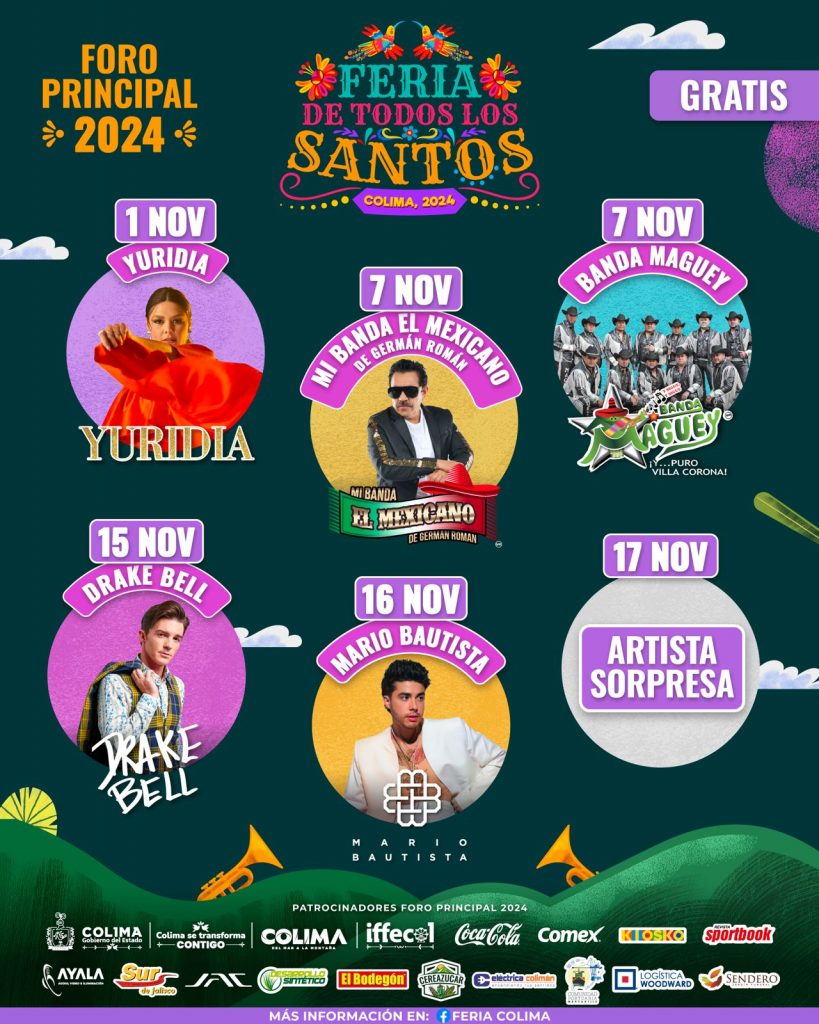 Desde Palacio de Gobierno, en el centro de la ciudad de Colima, la mandataria también destacó la oferta musical que será gratuita en el Foro Principal, durante la Feria de Colima. Bajo esa modalidad estarán ofreciendo conciertos artistas como Yuridia, este 1 de noviembre; Mi Banda el Mexicano, este 7 de noviembre; 15 de noviembre, Drake Bell; 16 de noviembre, Mario Bautista, y el domingo 17 de noviembre habrá la participación de un “artista sorpresa”.