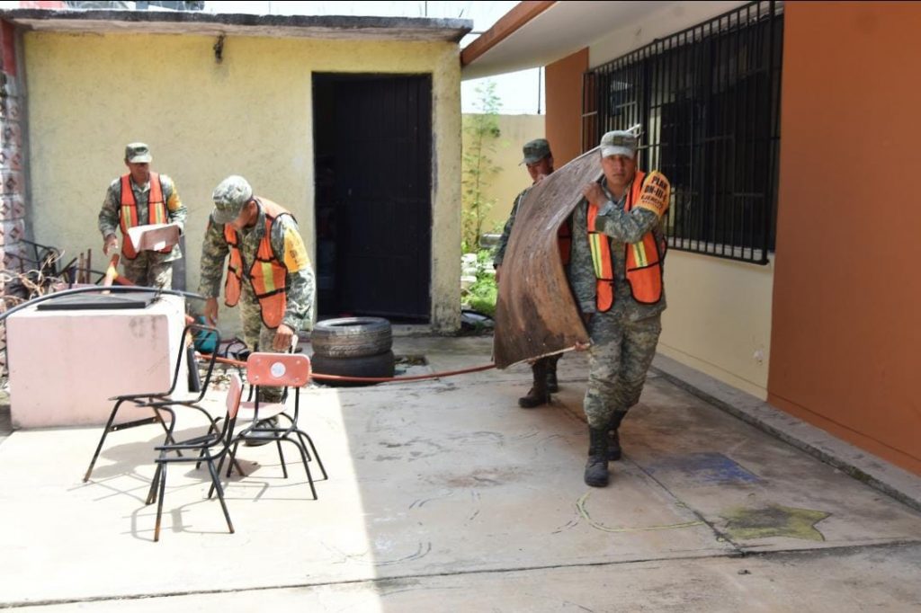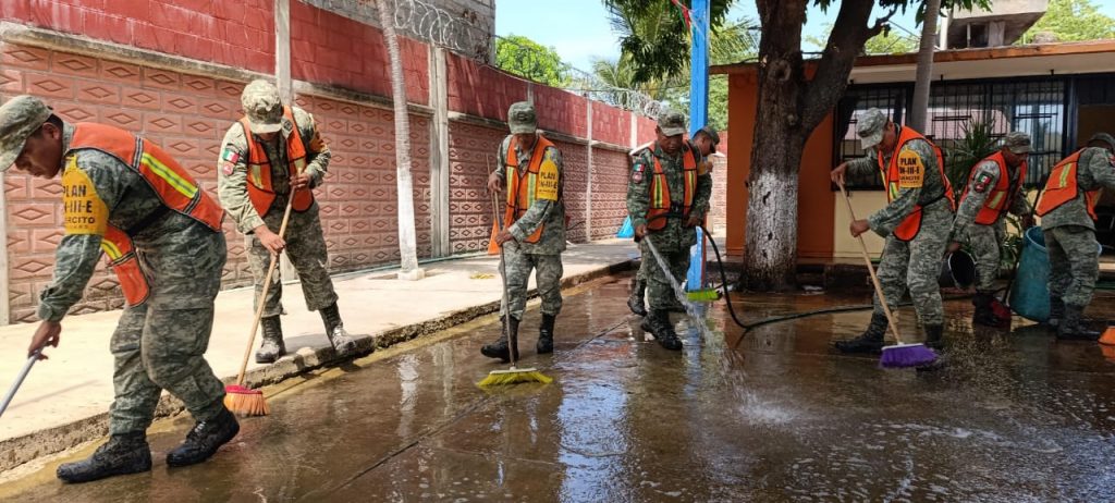 Efectivos del Ejército Mexicano están realizando la limpieza en los planteles educativos de este puerto.