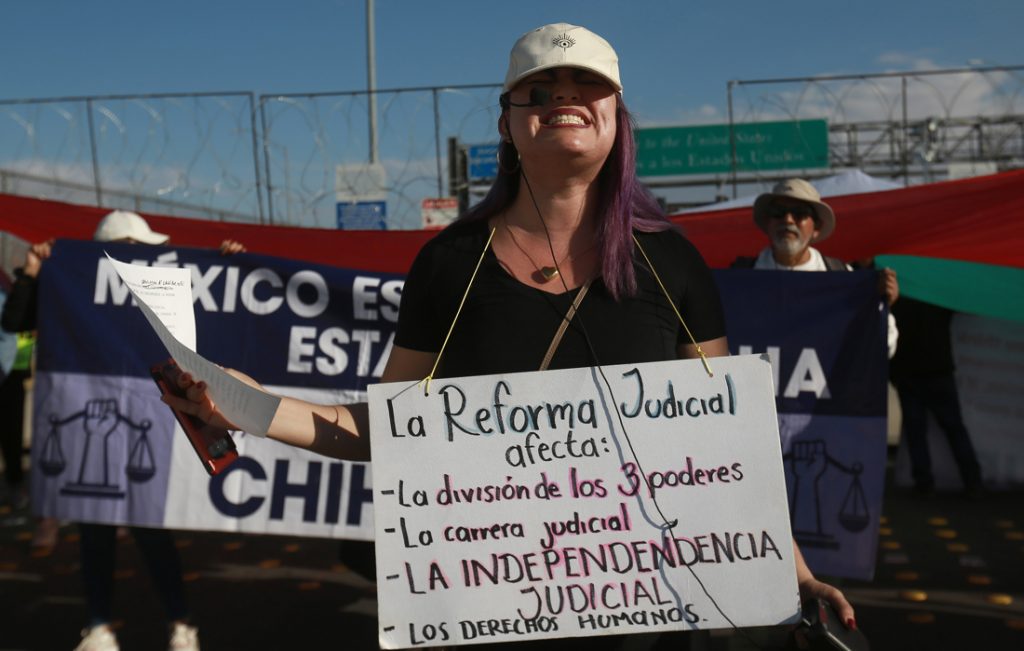 Decenas de manifestantes protestaron contra la reforma judicial en el Puente Internacional Córdova-Américas, que conecta Ciudad Juárez con El Paso, Texas.