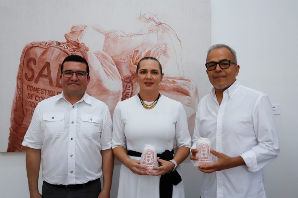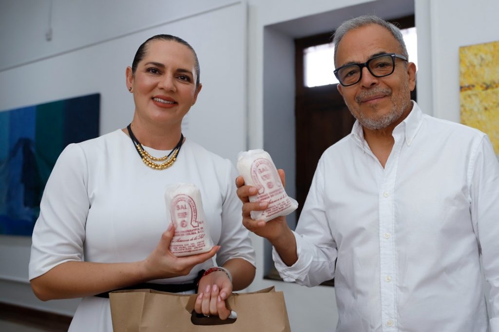 En un gesto significativo, Jerónimo Uribe entregó a Liliana Díaz la pieza “Sal de sol y mar”, un cuadro de gran formato inspirado en los costales con los que la Cooperativa de Salineros empaqueta su producto. Esta obra fue donada con el objetivo de generar recursos para la mejora del Museo de la Sal en Cuyutlán, Armería, un esfuerzo clave para preservar y difundir el patrimonio cultural de la región.