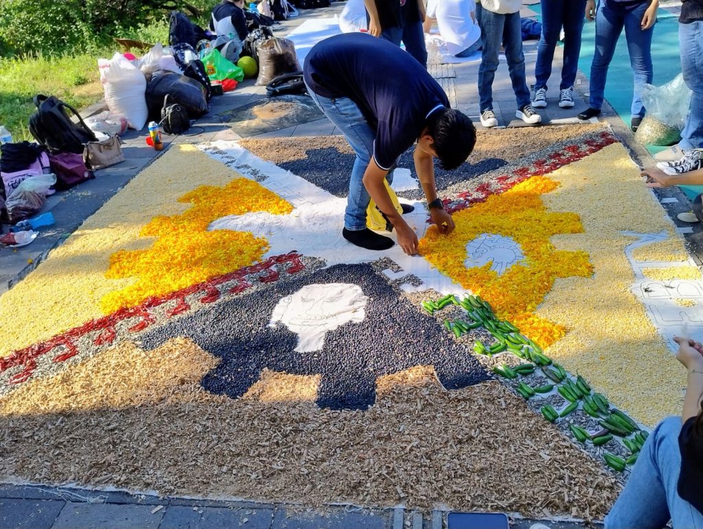 Los altares de muertos se están montando sobre lienzos de tela, utilizando diversos materiales, principalmente carbón molido, aserrín natural, aserrín de colores, granos, semillas, maíz, frijol de distintas variedades, girasoles, chiles secos, chiles verdes, sal, agua y flores de cempasúchil, entre otros.