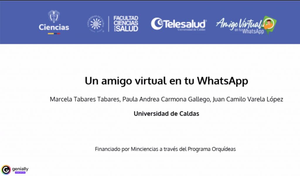Después de analizar distintos chatbots, desarrollaron “Un amigo virtual en tu WhatsApp”, el cual se basa en el modelo de inteligencia artificial de chat GPT, para la detección de síntomas de ansiedad y depresión y la generación de alerta en caso de ideas de suicidio. “Se implementa en jóvenes de 18 a 28 años en un municipio ZOMAC, que se llama Samacá”.