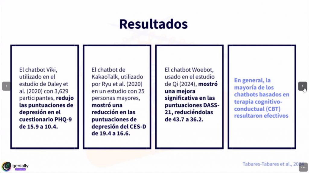 De acuerdo con Marcela Tabares, diversos estudios han probado que ciertas tecnologías como los chatbots (chats generados por inteligencia artificial que simulan tener una conversación), brindan mayor facilidad para que los jóvenes expresen cómo se sienten, lo que ayuda a reducir los estigmas sobre la salud mental. Asimismo, dijo que la ventaja de utilizarlas es que ofrecen intervenciones de apoyo psicológico 24/7, usan lenguaje natural y son económicas. “Esto permite que más personas reciban ayuda, independientemente de su ubicación o su situación económica”, enfatizó.