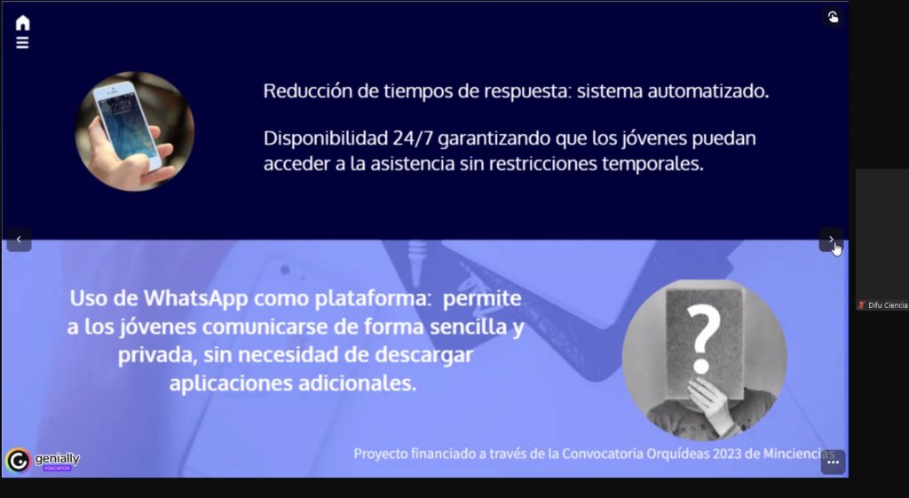 “No queríamos que la persona descargara una aplicación, ya que la mayoría no sabe cómo se usa el WhatsApp; entonces, primero realizamos una sensibilización ante el tema de la salud mental y después co-creamos esta chatbot junto con jóvenes, es decir, desde cómo les gusta ser llamados y cuáles son sus colores preferidos”, compartió.
