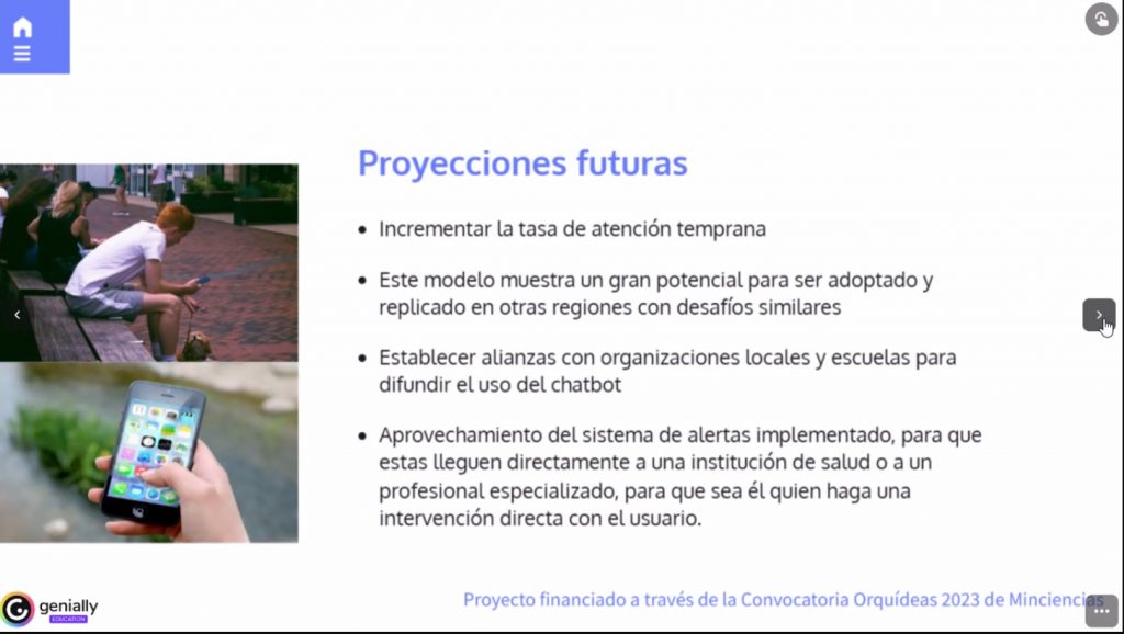 La joven investigadora compartió que algunos resultados de esa investigación muestran que los jóvenes están dispuestos a usarlos y que les generan confianza. “Con base en estos primeros resultados hemos realizado ajustes y mejoras. A futuro, buscamos incrementar la tasa de atención temprana, establecer alianzas con organizaciones locales, escuelas, y que se haga un uso de las alertas para que lleguen a una institución de salud o al especialista”, explicó.