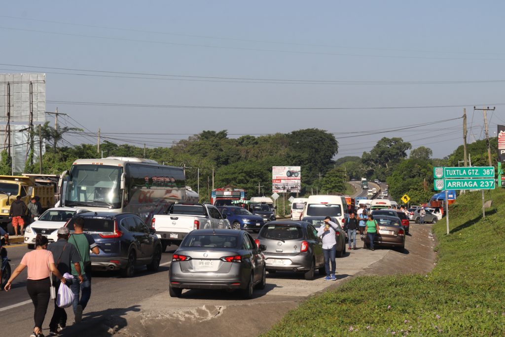 Los docentes atravesaron llantas, mantas, lonas, lazos y vehículos, y se instalaron sobre ambos carriles de la carretera federal 200 para evitar la circulación total de las unidades de transporte público y privado.
