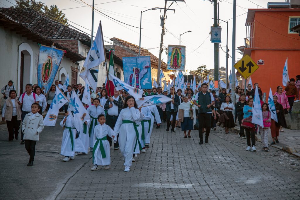 El contingente se reunió en la plazuela de la iglesia de Guadalupe, donde oficiaba misa el sacerdote Marcelo. Hombres y mujeres en su mayoría portaron banderas blancas con un estampado azul y la silueta de una paloma con una rama de olivo, como un símbolo de la paz.