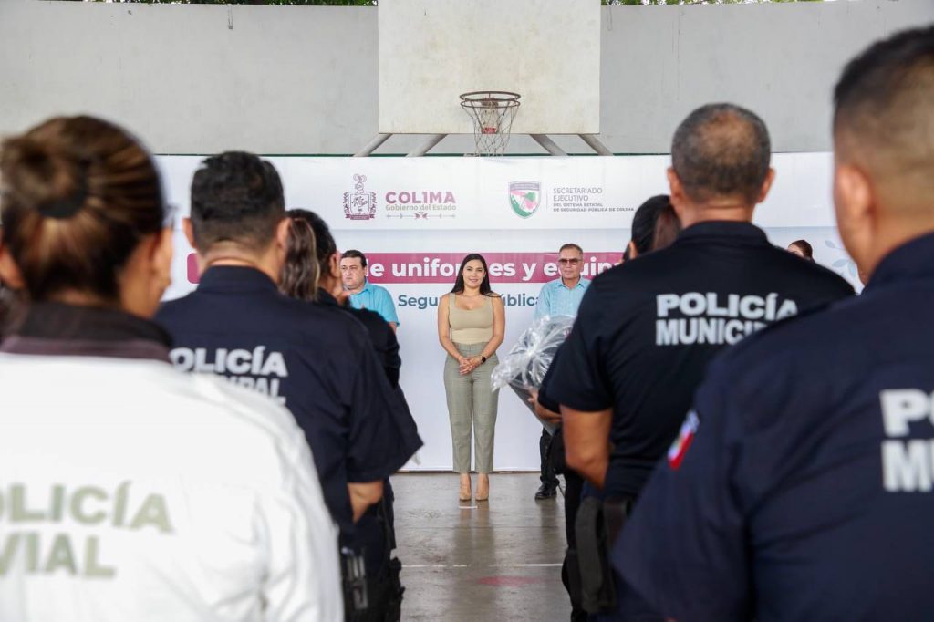 La gobernadora Indira Vizcaíno entregó uniformes y equipo a policías municipales de Armería y Tecomán, en eventos por separado, con una inversión global de 4 millones 269 mil 772 pesos, entre recurso estatal y del Fondo para el Fortalecimiento de las Instituciones de Seguridad Pública (Fofisp).