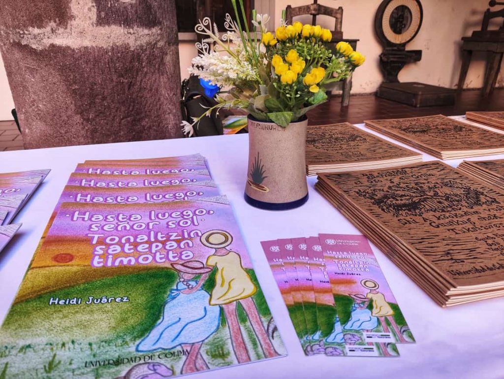 En el Museo Regional de Historia de Colima presentaron el libro bilingüe (español-náhuatl) Hasta luego, señor sol • Tonaltzin satepan timotta, de la autora Heidi Juárez Robles, editado por la Universidad de Colima. El libro aborda el tema de la infancia y el abandono paterno. Incluye ilustraciones de la propia autora y fue presentado por Alberto Llanes, Fernando Rodríguez y Karina Robles Gómez.