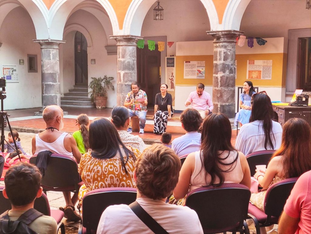 Antes de dar voz a la autora, Karina Robles leyó 2 páginas del libro en español y el maestro Alberto Juárez en náhuatl.