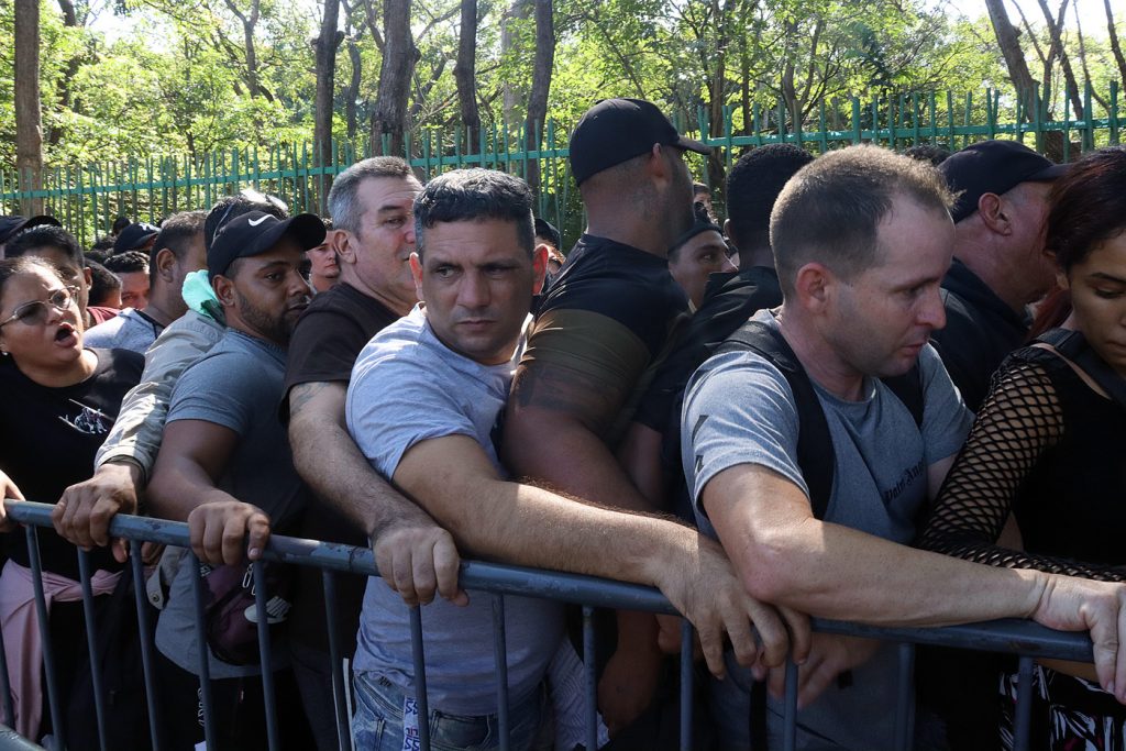 La aglomeración derivó este lunes en empujones y gritos, por lo que llegaron efectivos de la Guardia Nacional (GN) con equipos antidisturbios.