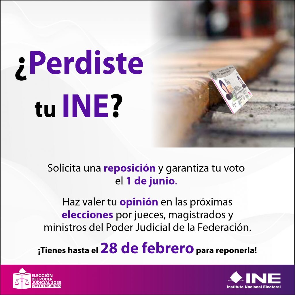 En información proporcionada por un comunicado, las autoridades del Instituto Nacional Electoral señalaron que, si una ciudadana o ciudadano extravió o sufrió la pérdida de su INE, puede recuperarla; por ello, reiteraron su llamado para quienes aún no han solicitado la reposición de su INE, para que se presenten cuanto antes en cualquier Módulo de Atención Ciudadana a más tardar el 28 de febrero.