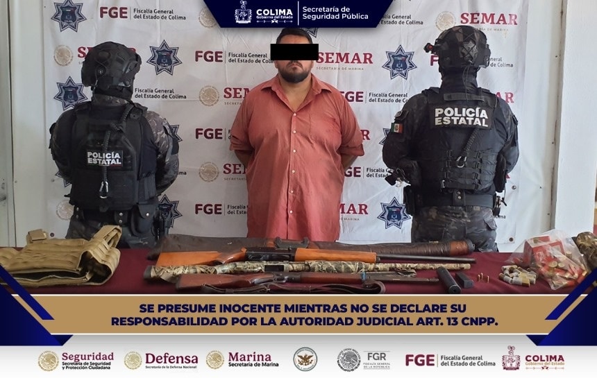 Elementos operativos de la Policía Estatal Preventiva (PEP) del Gobierno del estado de Colima, en coordinación con personal de la Secretaría de Marina Armada de México (Semar), detuvieron a un masculino, quien tenía en su poder varias armas largas, cartuchos útiles y diversos objetos, en hecho ocurrido en el municipio de Colima.