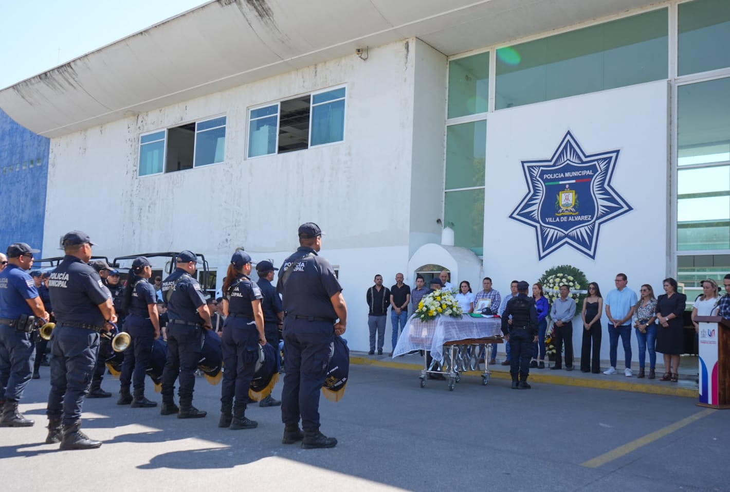 En las instalaciones del Complejo de Seguridad Pública de Villa de Álvarez, la presidenta municipal, luego de ofrecer sus condolencias y expresar su solidaridad, entregó a la esposa del policía caído la Bandera de México que cubría el féretro y el cuadro con una fotografía del agente.