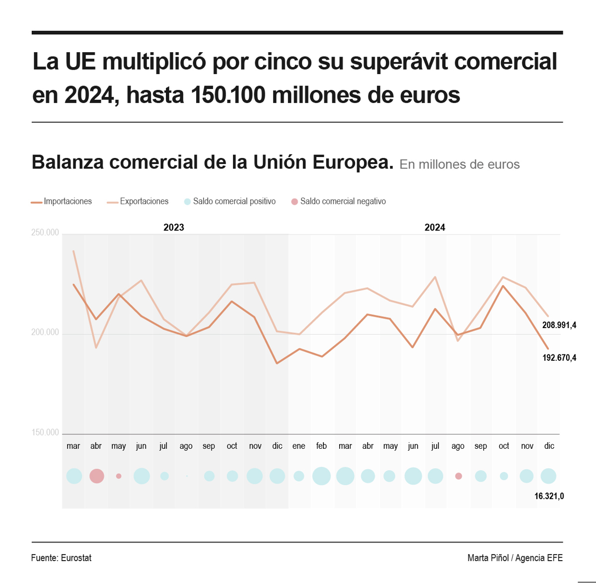 Por el contrario, la UE registró un déficit de 23,600 millones de euros en su comercio con China en el último mes de 2024, inferior al de 29,600 millones registrado en noviembre, pero muy superior al de 18,300 millones que tuvo en diciembre de 2023.