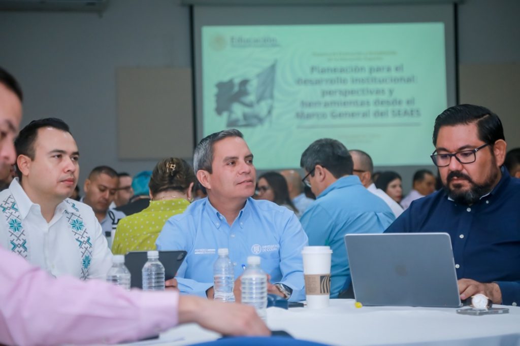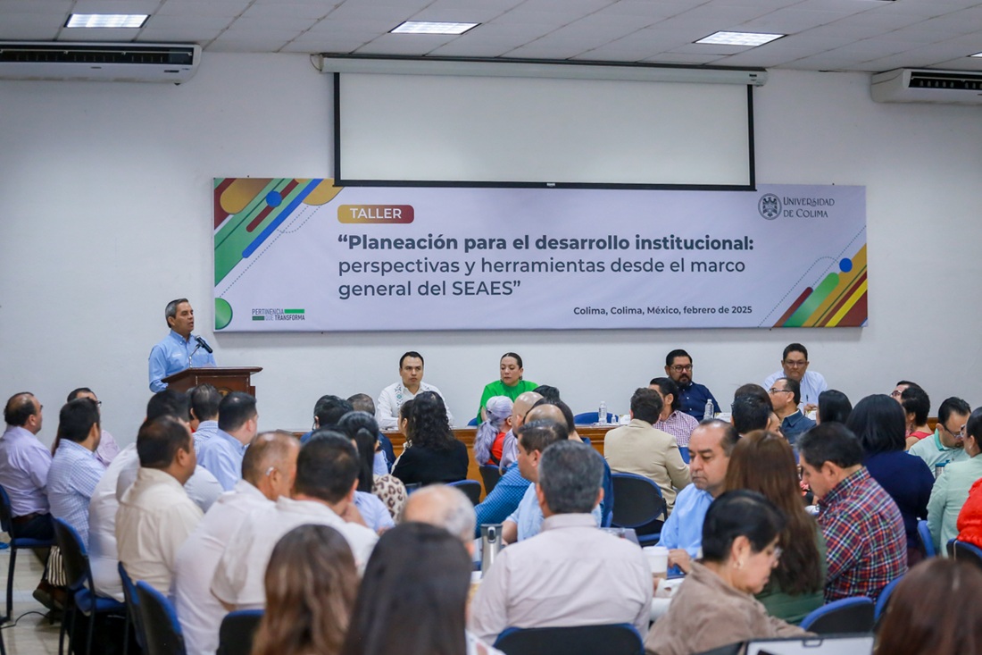 A lo largo de 4 horas se realizó el Taller de Planeación para el Desarrollo Institucional “Perspectivas y herramientas desde el marco general del SEAES”, con el que iniciaron los trabajos para la elaboración del Plan Institucional de Desarrollo, que dictará el rumbo y las acciones de la Universidad de Colima (UdeC) para el período 2026-2029. Lo impartieron María José Rhi Sausi Garavito y Adán Martínez Hernández, del SEAES.