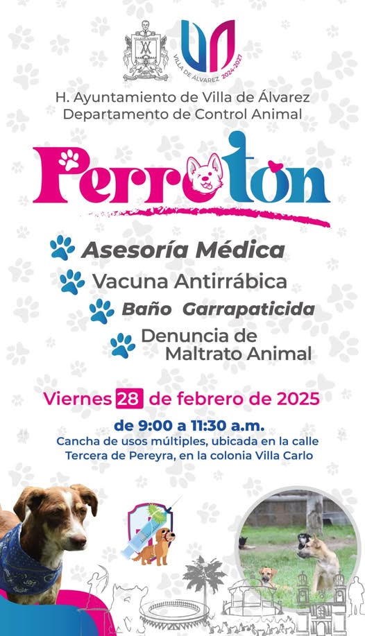 El Gobierno municipal de Villa de Álvarez continúa brindando bienestar a los animales de compañía con el programa “Perrotón”, el cual estará el próximo 28 de febrero en la colonia Villa Carlo.