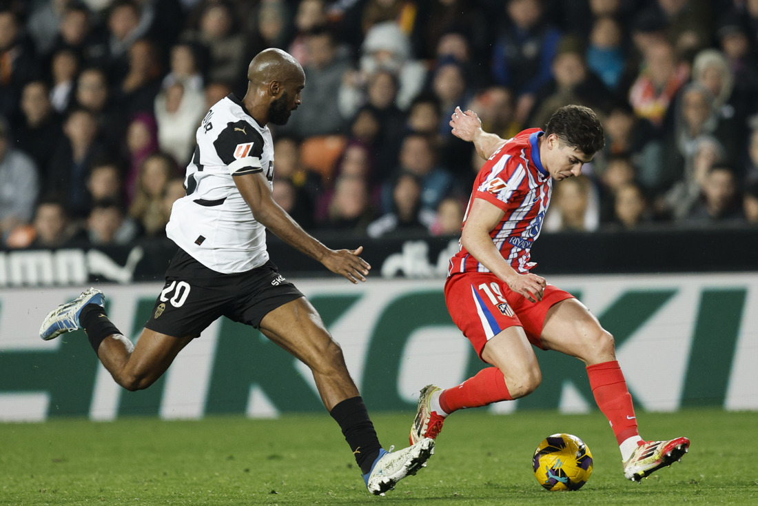 Griezmann metió un espectacular pase para Lino, que se desmarcó a la perfección y estrelló el cuero en el larguero. Pero allí estuvo Giuliano para dejarle el rechace a Julián Álvarez que, ayudado de la poca contundencia defensiva local, marcó el 0-1 (m.12). El Valencia intentó rehacerse, pero su juego no era fluido ante un rival al que no le hacía falta ni esforzarse.