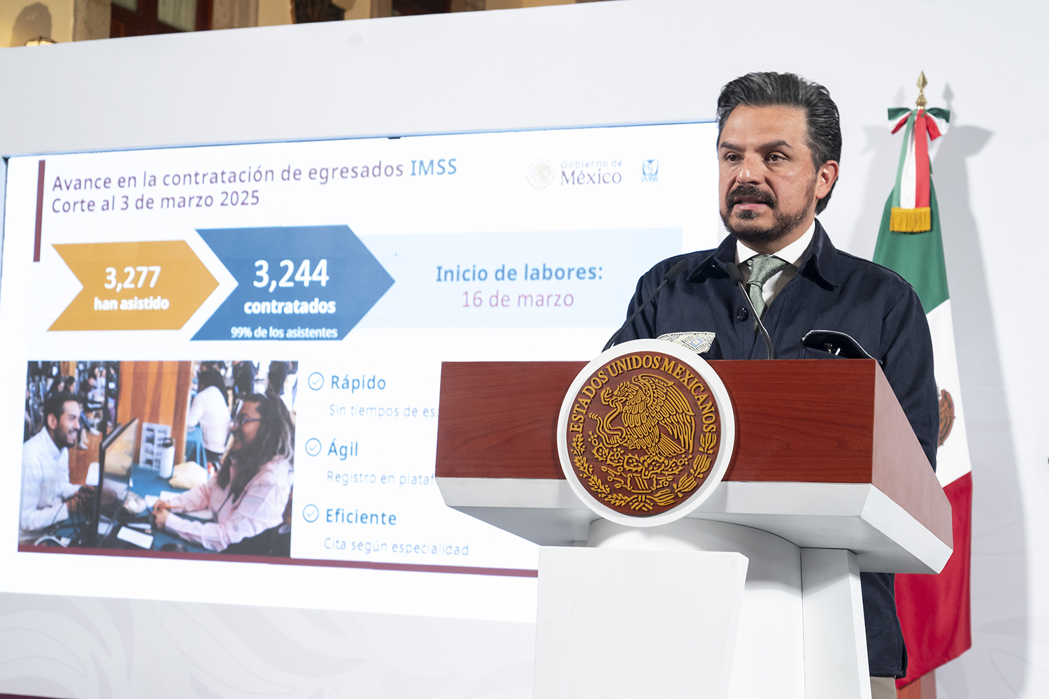 El director del Instituto Mexicano del Seguro Social (IMSS), Zoé Robledo, informó sobre el avance en la contratación de médicas y médicos especialistas para fortalecer el sistema de salud.