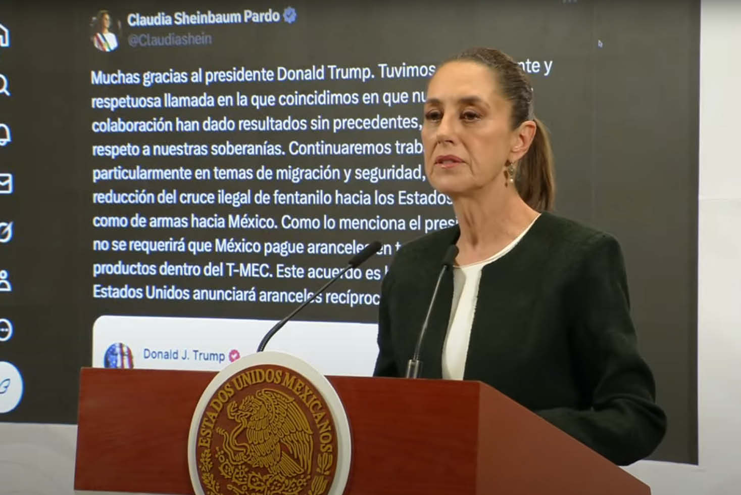 La presidenta, Claudia Sheinbaum, celebró este jueves el aplazamiento de un mes en los aranceles del 25% anunciados por EUA, tras sostener una llamada “excelente y respetuosa” con el presidente estadounidense, Donald Trump, y destacar una colaboración con “resultados sin precedentes” entre ambos países.