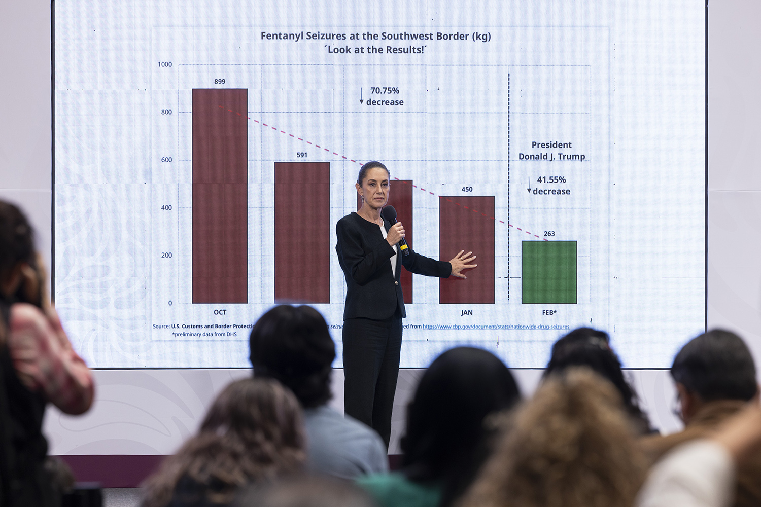 Según Sheinbaum, desde octubre de 2024, cuando asumió la Presidencia de México, las incautaciones de esta droga fueron a la baja en EUA y la cifra se redujo todavía más desde que el 3 de febrero decidió enviar a 10 mil integrantes de la Guardia Nacional a la frontera entre ambas naciones y reforzar la revisión de aduanas.