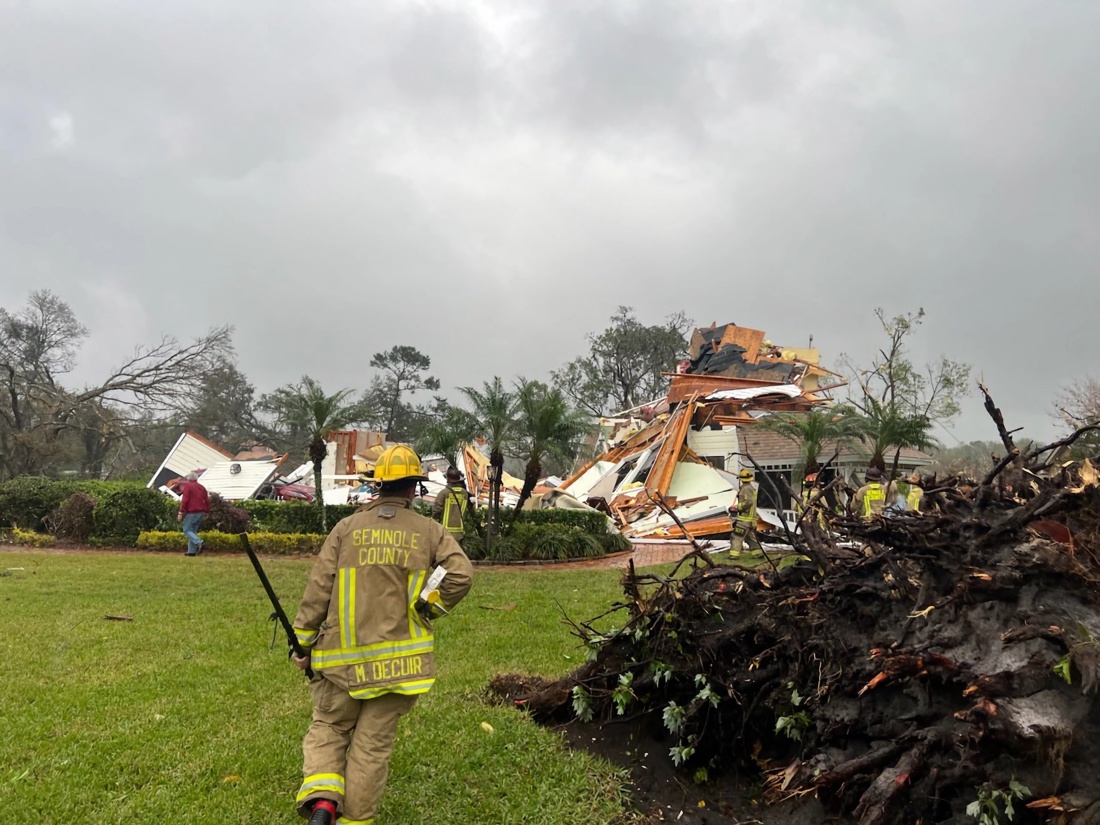 El Servicio Meteorológico Nacional (NWS, en inglés) confirmó que el tornado tocó tierra en el condado de Seminole con vientos de hasta 185 kilómetros por hora. La tormenta avanzó rápidamente, cruzó la autopista I-4, que lleva a los parques de Disney y Universal Studios, y golpeó directamente los estudios de FOX 35 Orlando en Lake Mary, mientras la estación transmitía en vivo.